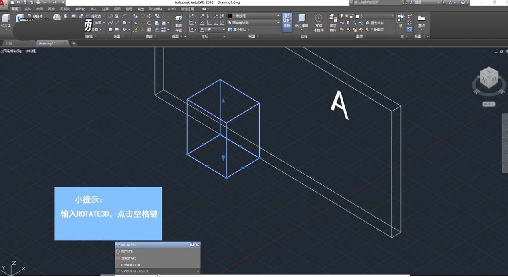 2、選中該立方體,在命令行中輸入ROTATE3D,點擊空格鍵確定。