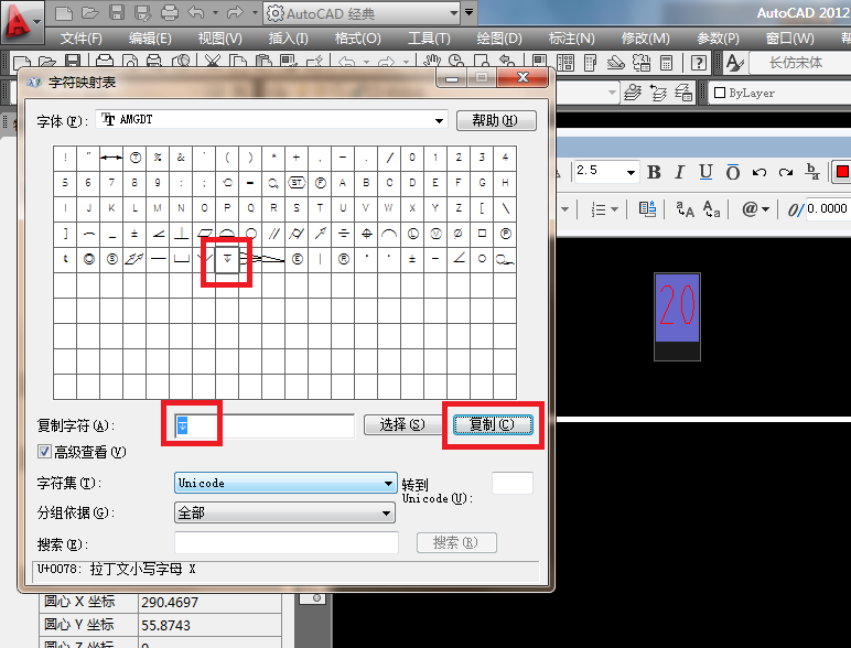 5、如下圖所示,彈出了“字符映射表”,先選擇字體“AMGDT”,在出現(xiàn)的字符中找到深度符號。說明一下,這個字體也是一個一個的找的,看那個字體中有深度符號,就選擇哪個字體。