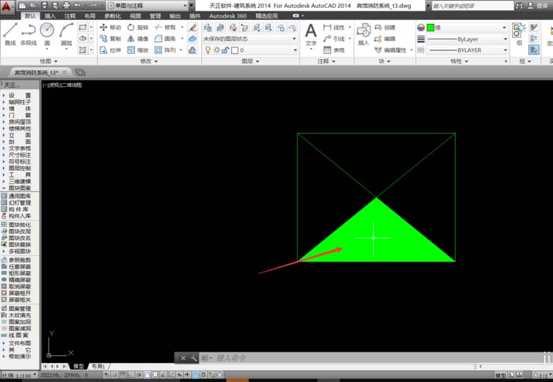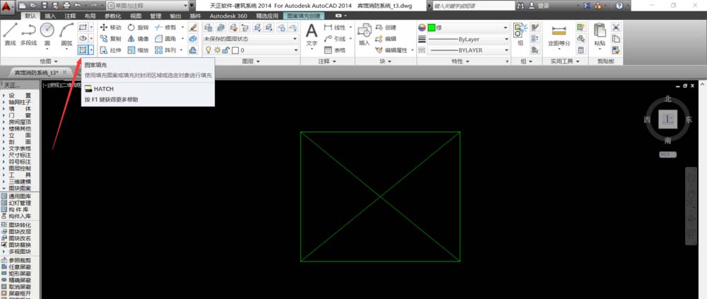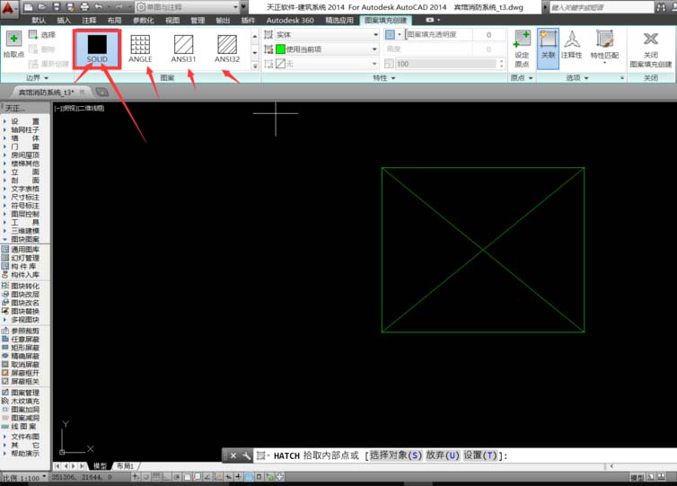 7、完成大致的消防箱框架之后,我們在AutoCad上方的菜單命令欄中,選擇“圖案填充”,對消防箱進行最后一步的處理,對無栓口的一側填充顏色。