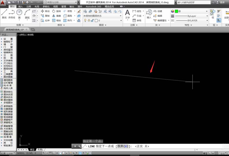 3、確定直線繪圖命令后,我們就可以使用鼠標左鍵單擊隨意一個區域,進行直線的繪制,但是此時直線并不一定的水平垂直的,我們最好開啟“正交鎖定”后再進行繪制。