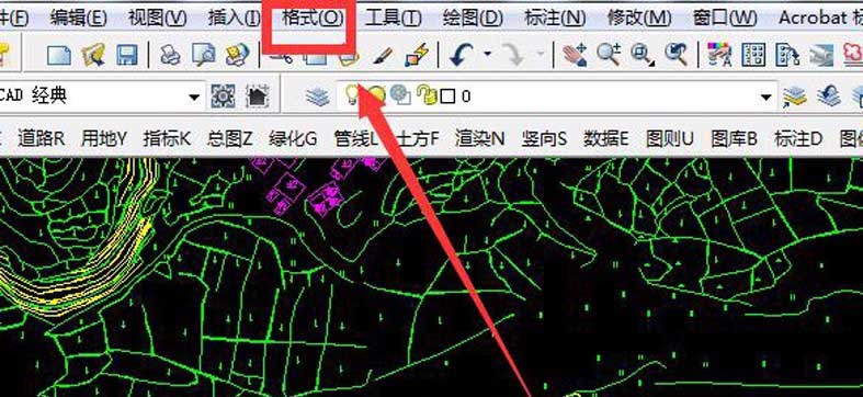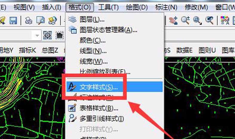 2、待cad地形文件打開之后,在AutoCAD軟件菜單欄找到“格式”設置菜單,然后在該菜單下找到“文字樣式”,并點擊“文字樣式”打開該選項卡,如圖