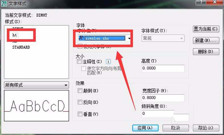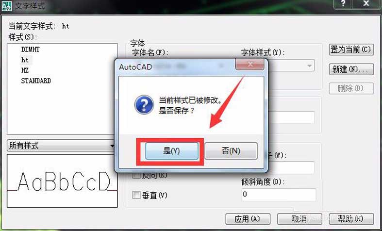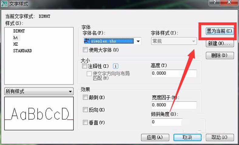 3、打開“文字樣式”設置選項卡之后,修改樣式為"hz",字體為“simplex.shx”,之后點擊“置為當前”按鈕,選擇“是”,保存該設置,如圖