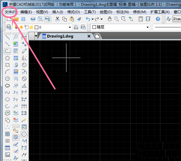 2、打開中望CAD,進入首頁,菜單欄找到“文件”;