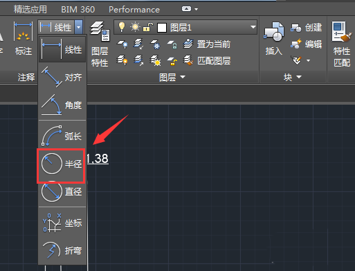 9、點擊線性標注選項,在其子級菜單里找到半徑標注選項,如圖所示: