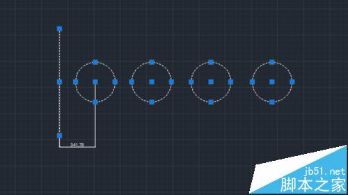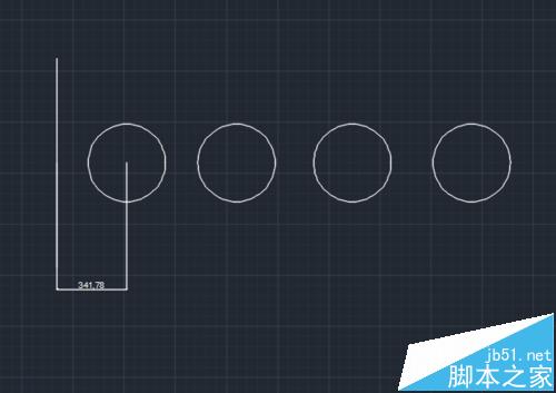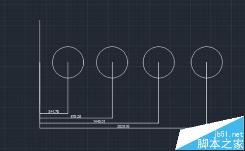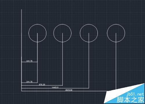 2、首先來看一下不使用快速標(biāo)注的基線標(biāo)注,下面是一條直線和若干個圓,要做這幾個的基線標(biāo)注首先要做一下直線和第一個圓的線性標(biāo)注,然后使用基線標(biāo)注命令依次進(jìn)行標(biāo)注。