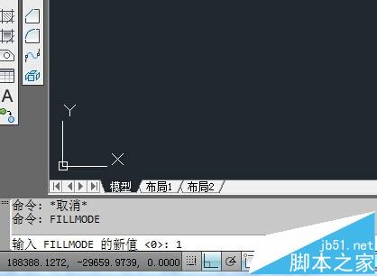 2、執(zhí)行“FILLMODE”命令后可以看到“請輸入FILLMODE的新值<0>”提示,提示文字中括號里的數(shù)字為“0”,表明當(dāng)前模式FILLMODE的值是“0”,該值等于“0”代表空心,該值等于“1”代表實(shí)心。因此輸入“1”并執(zhí)行(回車)。多線段就變成實(shí)心的模式了。但是此時(shí)的圖形是空心的,依舊沒有變成實(shí)心,這是因?yàn)槲覀兊囊晥D沒有更新,需要更新一下視圖。