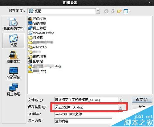 2、在彈出的“圖形導出”對話框中,選擇路徑,填寫文件名后,在“保存類型”一欄選擇“天正3文件”。點擊“保存”。