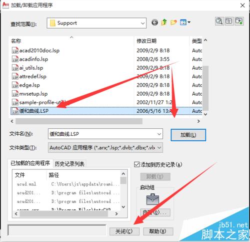 3、找到“緩和曲線.LSP”工具,選中它,點擊加載。然后再點擊關閉。