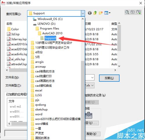 2、進入程序加載框,找到CAD安裝的位置和support文件夾。