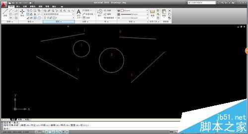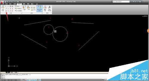 4、其他約束命令的操作基本一樣,接下來我們通過不同的約束命令相切,相交,平行等組合來畫一個簡單的組合圖形,常用工具下直線和圓,分別畫出一大一小兩個圓和四條直線。為方便操作,我們?yōu)槠浯蛏嫌嬏枴?/p>
