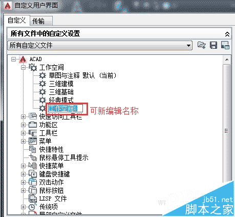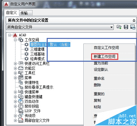 2、點(diǎn)擊“自定義”之后,彈出下圖界面,在藍(lán)色框內(nèi)右擊后,彈出子菜單,點(diǎn)擊“新建工作空間”