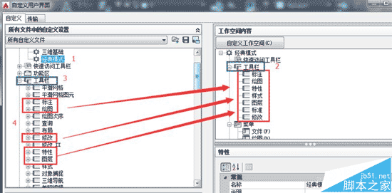 4、然后點(diǎn)擊新生成的工作空間,右邊會(huì)彈出改該工作空間的內(nèi)容結(jié)構(gòu),先點(diǎn)一下右邊的工作內(nèi)容結(jié)構(gòu)里的“工具欄”的“+”(此時(shí)是空白的),再點(diǎn)左邊的“工具欄”的“+”打開次級(jí)菜單,把里面需要的內(nèi)容拖進(jìn)去右邊,一般就“標(biāo)注,繪圖,特性,樣 式,圖層,標(biāo)準(zhǔn),修改”可以了,然后先按“應(yīng)用”,再按“確定”退出這個(gè)界面