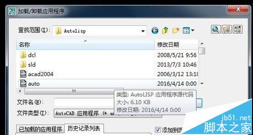 3、輸入命令:APPLOAD,加載應用程序,找到D盤中Autolisp插件文件夾打開,并全選文件,點擊加載;
