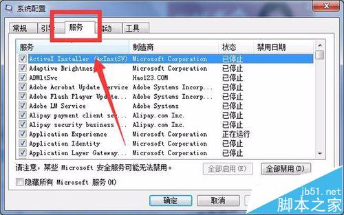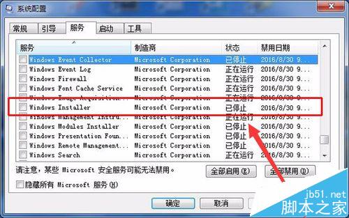 3、最后,在電腦“系統配置”窗口找到“服務”,然后在“服務”窗口下找到“windows installer”設置選項,然后將其“禁用”,如圖