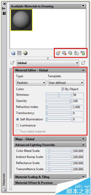 現在啟動材料命令打開調色板的材料。調色板是用來在AutoCAD 中大致相同的方式為對話框。一個很大的區別是,他們可以留在屏幕上要繪制一段時間。您可以通過點擊左下角<或>按鈕展開或折疊的調色板。通過單擊X在左上角關閉它。在調色板的頂部顯示為球在默認視圖圖中所用的材料。下面是將要使用的材料來進行操作的按鈕,并在底部有一個部分用于編輯的素材。