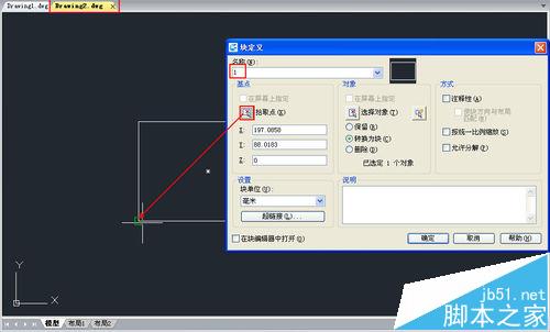 2、單擊新建按鈕,新建一張空?qǐng)D,繪制一個(gè)矩形,輸入B,回車,將矩形定義成圖塊,塊名也設(shè)置為1,插入點(diǎn)設(shè)置在矩形的某個(gè)角點(diǎn),如下圖所示。