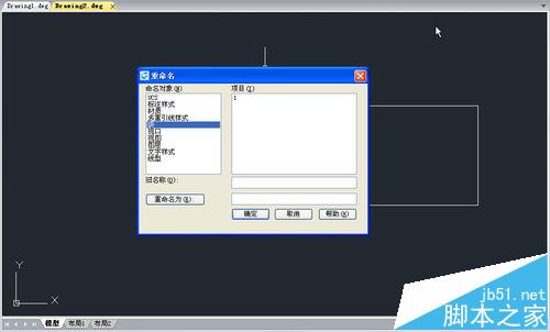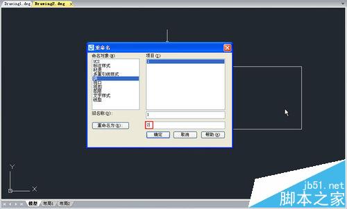 2、在左側(cè)的列表中選擇“塊”,在右側(cè)的列表中選擇“1”,在“重命名”框內(nèi)輸入2,如下圖所示,單擊確定按鈕,將圖塊名從1改成2 。