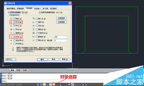 1、首先確認打開了中點和交點捕捉方式,確認底部狀態中的對象追蹤按鈕被按下,如下圖所示。