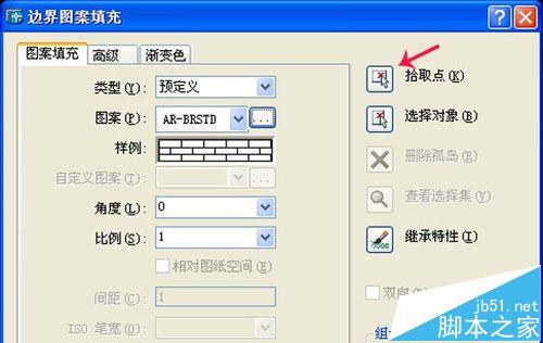4、選擇好圖案后,鼠標左鍵單擊如圖所示的箭頭所指的按鈕,【拾取點】。如果這里沒有拾取,則無法完成繪制。