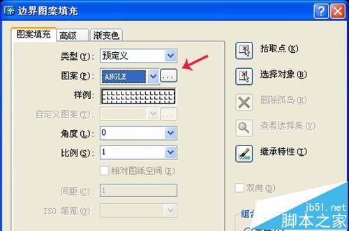2、在彈出的【圖案填充】的窗口上進行選取圖案,可以找默認的。鼠標左鍵單擊如圖箭頭所指的按鈕。