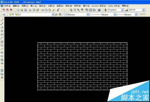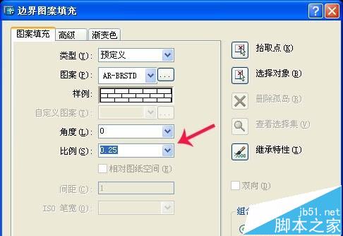 6這時又返回圖案填充的窗口上,在箭頭所指處,修改下比例,默認是1,將其改為0.25,則更像墻壁些,最后單擊【確定】,這時再返回主窗口看到,很漂亮的封閉圍墻繪制好了。