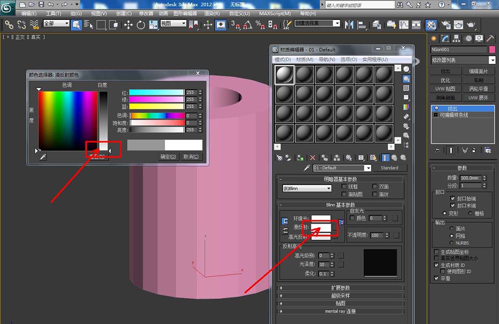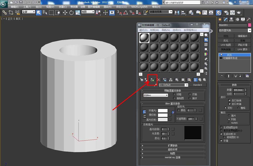 4、點(diǎn)擊【材質(zhì)編輯器】,按圖示設(shè)置一個(gè)白色材質(zhì)球并附加給模型即可。這樣我們的鏤空?qǐng)A形二十二邊柱就制作完成了,趕緊試試吧!
