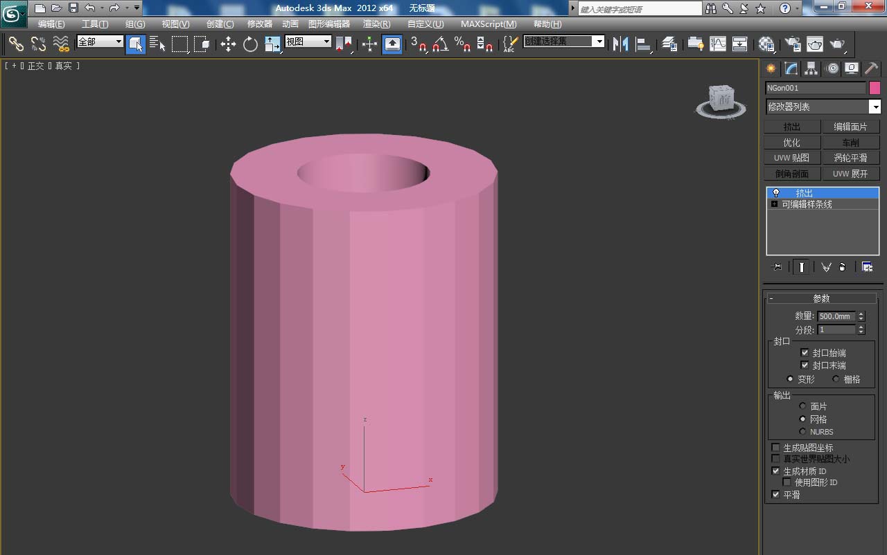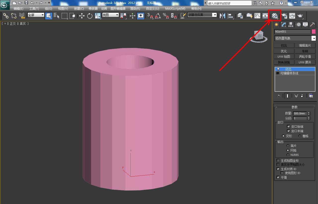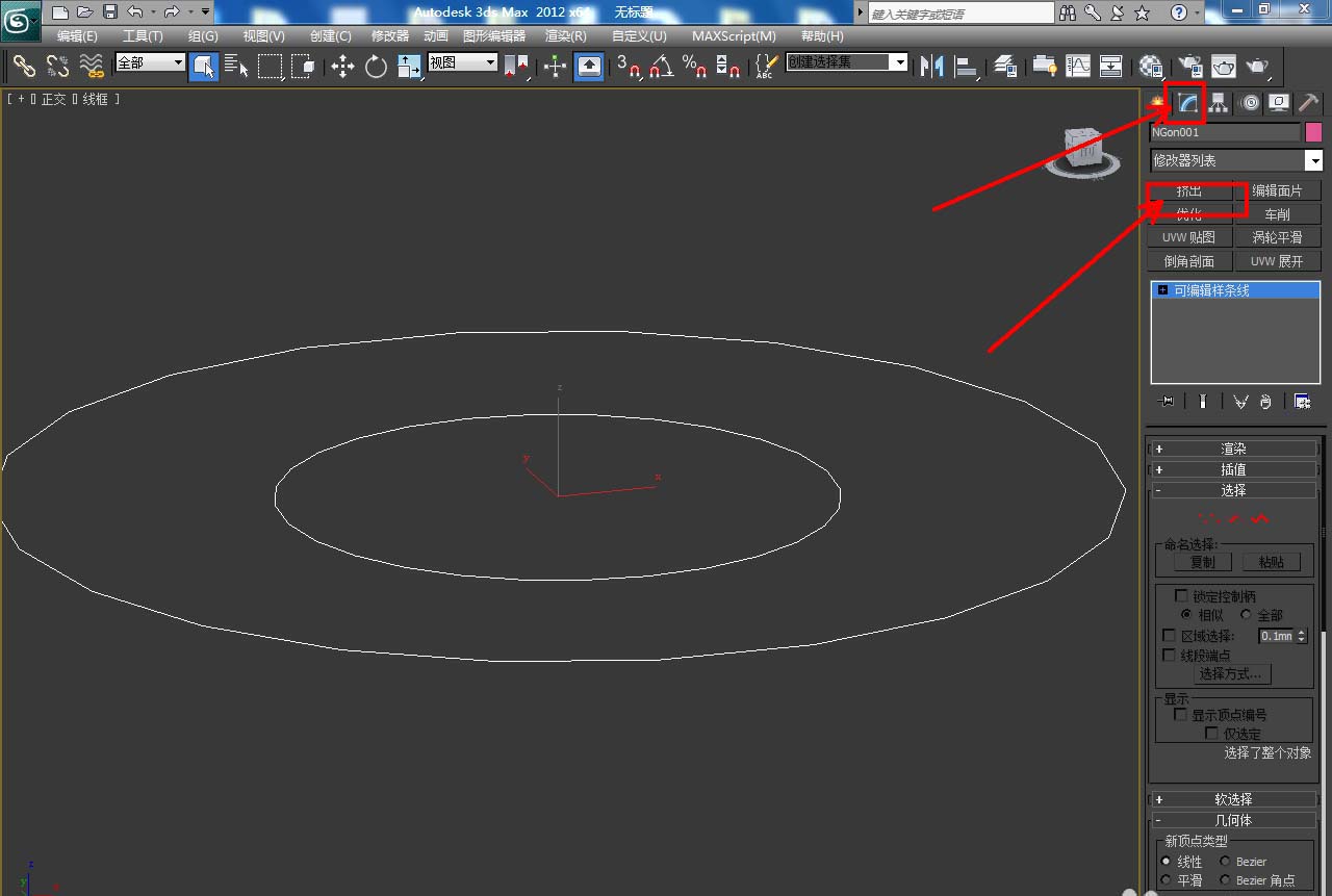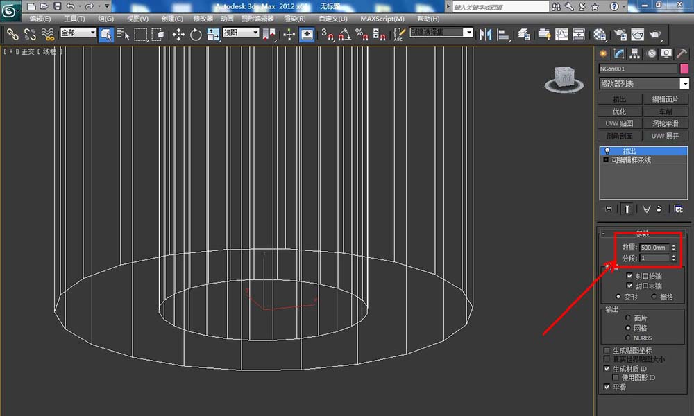 3、選中鏤空?qǐng)A形二十二邊形圖案,點(diǎn)擊【修改】-【擠出】,按圖示設(shè)置好擠出的各個(gè)參數(shù),繪制出一個(gè)鏤空?qǐng)A形二十二邊柱模型;