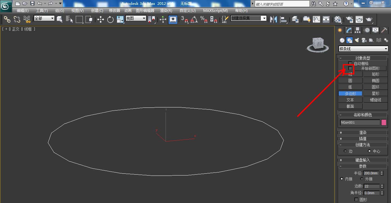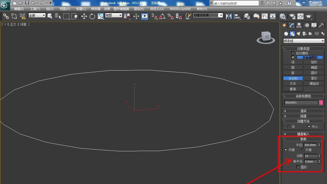 2、點(diǎn)擊【創(chuàng)建】-【圖形】,去掉【開始新圖形】前面的勾后,點(diǎn)擊【多邊形】,按圖示參數(shù)繪制出一個(gè)二十二邊形圖案。點(diǎn)擊【圓形】,按圖示參數(shù)繪制出一個(gè)圓形圖案;