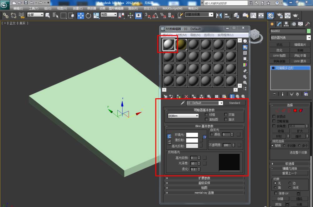 2、點擊【材質編輯器】,按圖示設置好一個白色材質球、墨綠色材質球以及一個貼圖材質球(如圖所示);