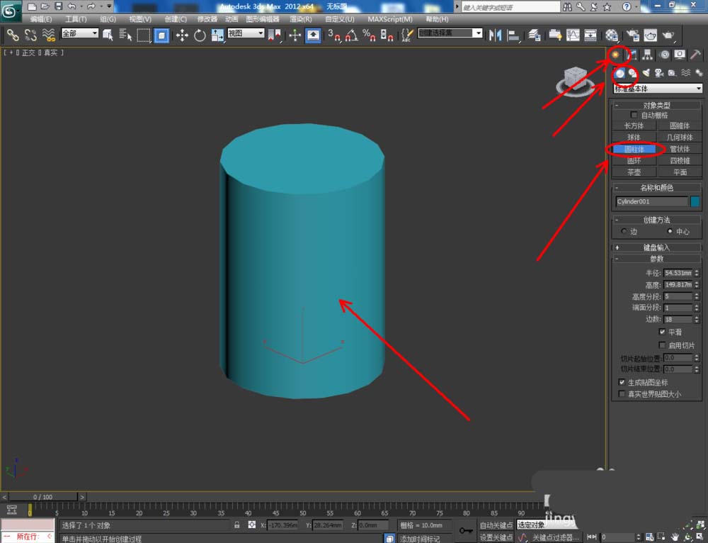 1、打開3Dmax2012軟件,點擊【創建】-【幾何體】-【圓柱體】,繪制一個圓柱體模型;
