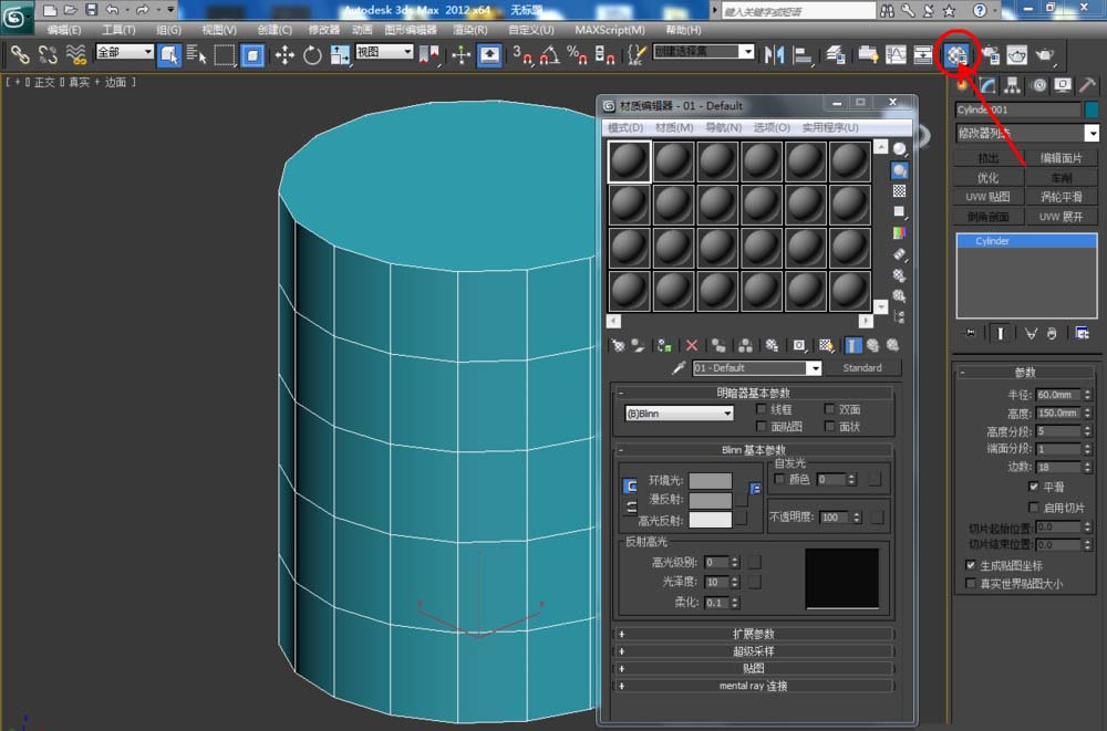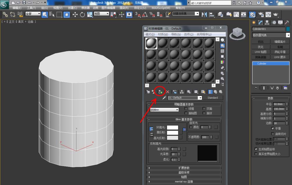 4、選中圓柱體,點擊【將材質指定給選定對象】將材質附加上去,這樣我們圓柱體模型就制作完成了。