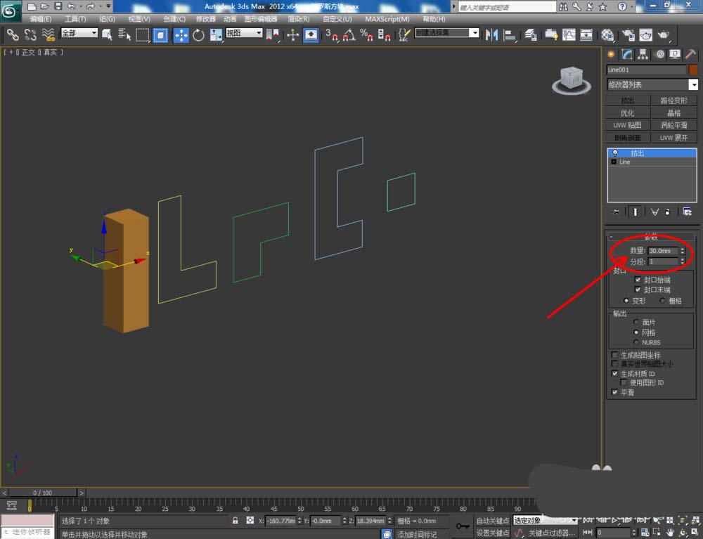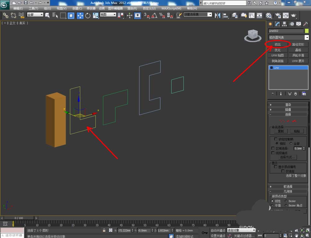 3、選中第一個圖案,點擊【修改】-【擠出】,按圖示設置好擠出的各個參數,完成第一個積木模型的制作。同樣的步驟,完成另外幾個圖案的擠出操作(如圖所示);