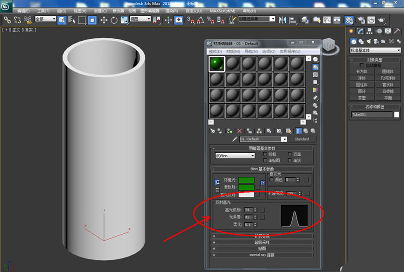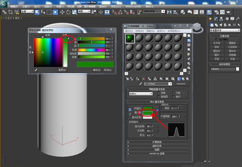 2、點擊【材質編輯器】彈出材質編輯器設置欄,按圖示設置一個綠色光面材質球并將材質球附加給管狀體模型,這樣我們通過軟件自帶管狀體工具制作的管狀體模型就完成了;
