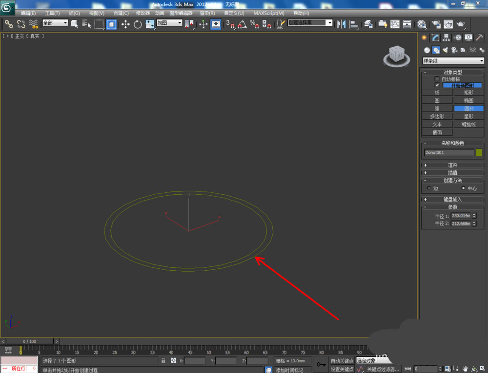 3、點擊【創建】-【圖形】-【圓環】,按圖示在作圖區域繪制一個圓環圖案并按圖示設置好圓環的各個參數。選中圖案,點擊【對象顏色】將模型的對象顏色設置為:白色(如圖所示);