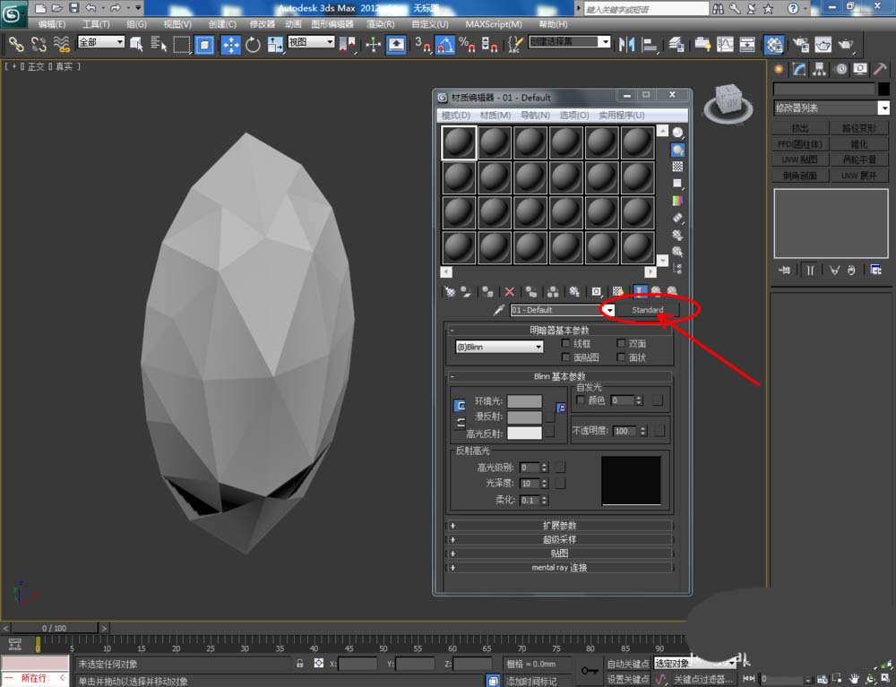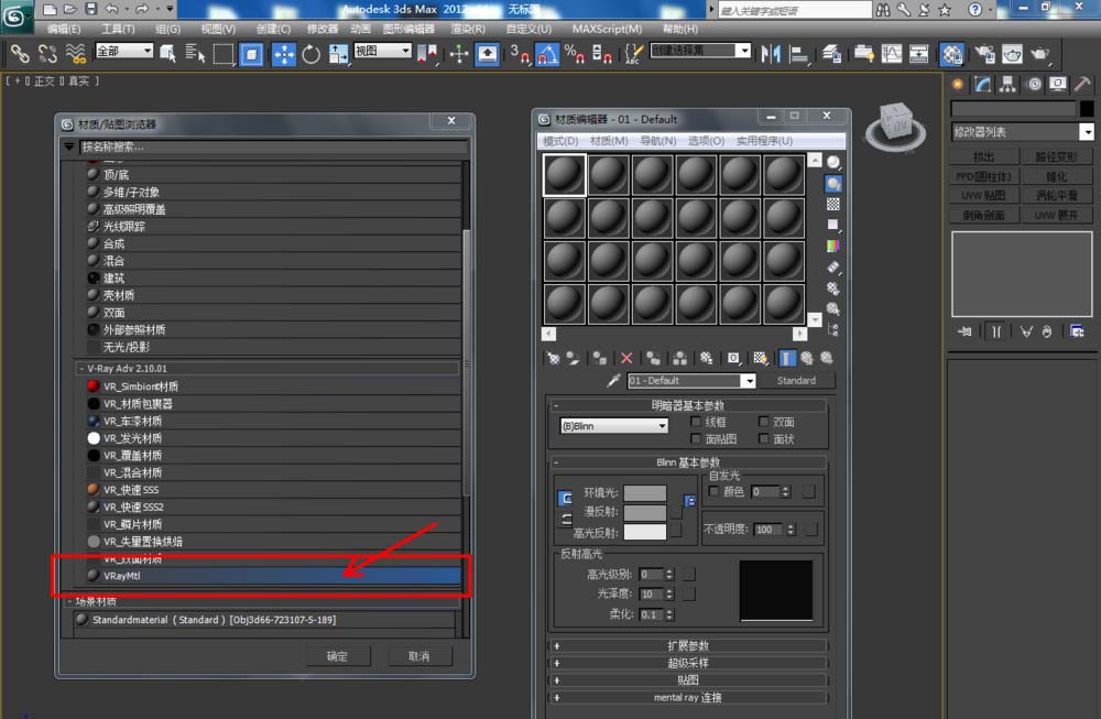 3、點擊【材質編輯器】,彈出材質編輯器設置框,點擊【standard】-【VAryMlt】設置一個Vary材質球,按圖示設置好【反射】與【折射】中的各個參數,制作出一個橄欖石材質球。完成后將材質球附加給模型(如圖所示);