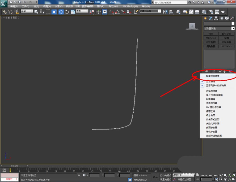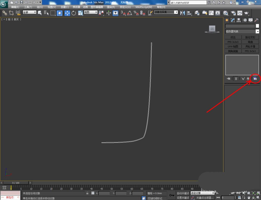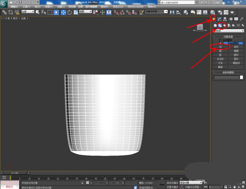 1、打開3Dmax2012軟件,點(diǎn)擊【創(chuàng)建】-【圖形】-【線】,在作圖區(qū)域繪制一個線段圖案。點(diǎn)擊右邊工作區(qū)中【頂點(diǎn)】圖標(biāo),對圖示圖案上的點(diǎn)進(jìn)行圓化處理。點(diǎn)擊【樣條線】,選取樣條線,對樣條線進(jìn)行輪廓操作(如圖所示);