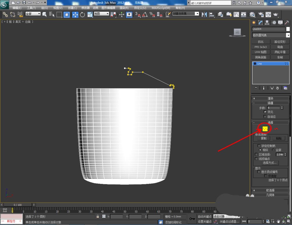 3、點(diǎn)擊【創(chuàng)建】-【圖形】-【線】,按圖示繪制一個線段圖案。點(diǎn)擊右邊工作區(qū)中的【頂點(diǎn)】,對圖案上的點(diǎn)進(jìn)行圓化操作。點(diǎn)擊【樣條線】,同樣對選區(qū)樣條線后進(jìn)行輪廓處理(如圖所示);