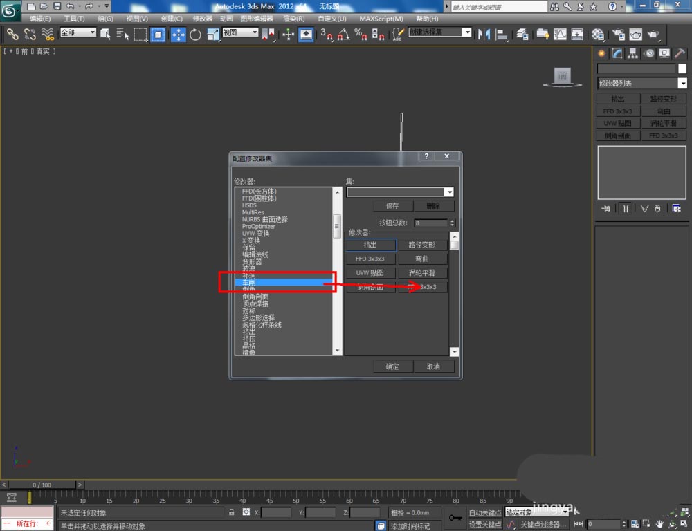 2、點(diǎn)擊【修改】-【配置修改器集】,彈出配置修改器集設(shè)置欄,找到【車削】并將其拉動到右邊選項(xiàng)框中,點(diǎn)擊【確定】將車削調(diào)出。選中圖案,點(diǎn)擊【車削】并按圖示設(shè)置好車削的各個參數(shù);