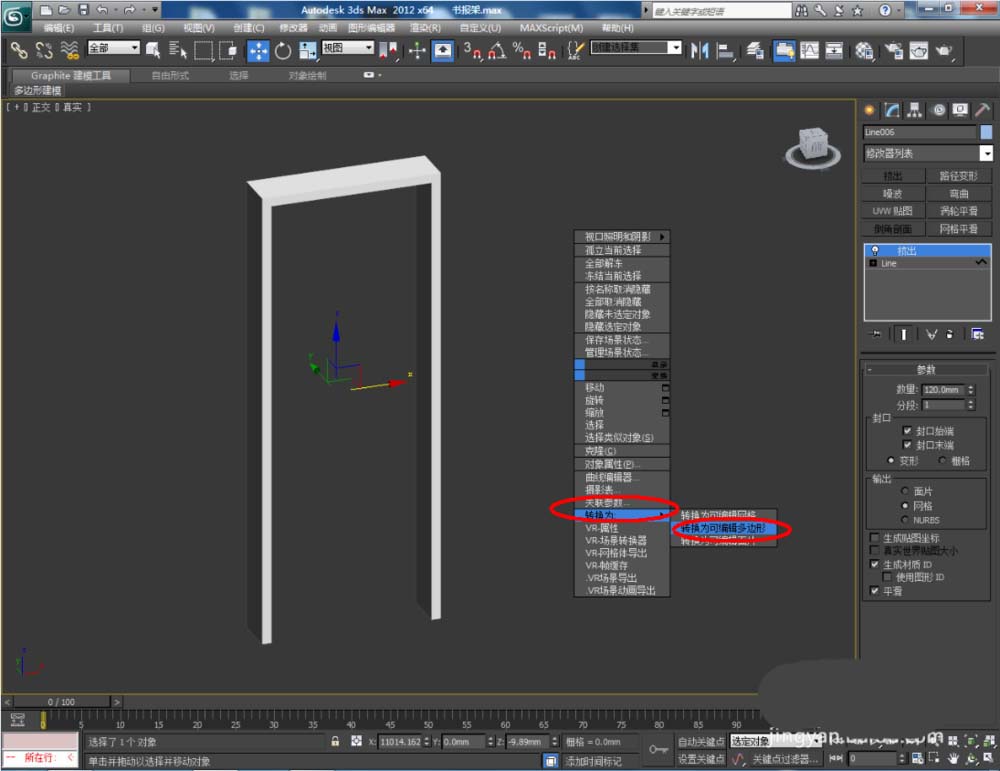 2、點擊右邊工作區中的【樣條線】圖標,框選所有樣條線對樣條線進行輪廓處理,輪廓系數設置為:25。完成后,點擊【擠出】,擠出數量設置為:120mm,制作出框架模型并附上一個白色材質球(如圖所示);