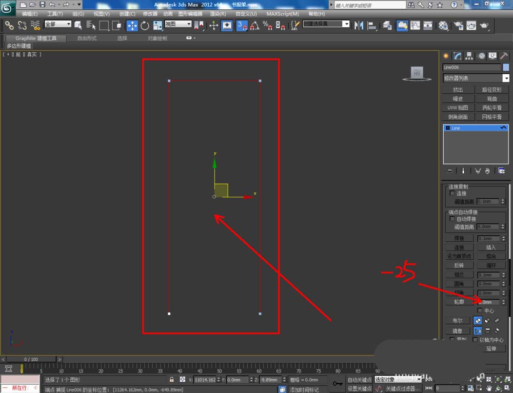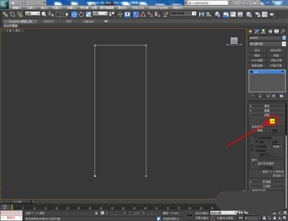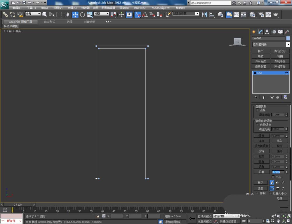 1、打開3Dmax2012軟件,點擊【創建】-【圖形】-【矩形】,在作圖區域繪制一個1280*500mm的矩形參考線圖案。點擊【線】,以矩形圖案為參考,繪制一個線段圖案并將矩形參考圖案刪除(如圖所示);