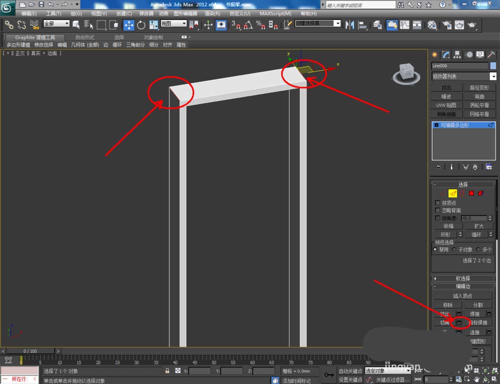 3、選中模型,點擊鼠標右鍵-【轉換為】-【轉換為可編輯多邊形】。點擊右邊工作區中的【邊】圖標,選中圖示模型上的邊后,點擊【切角】右邊的小方框并按圖示設置好切角的各個參數;