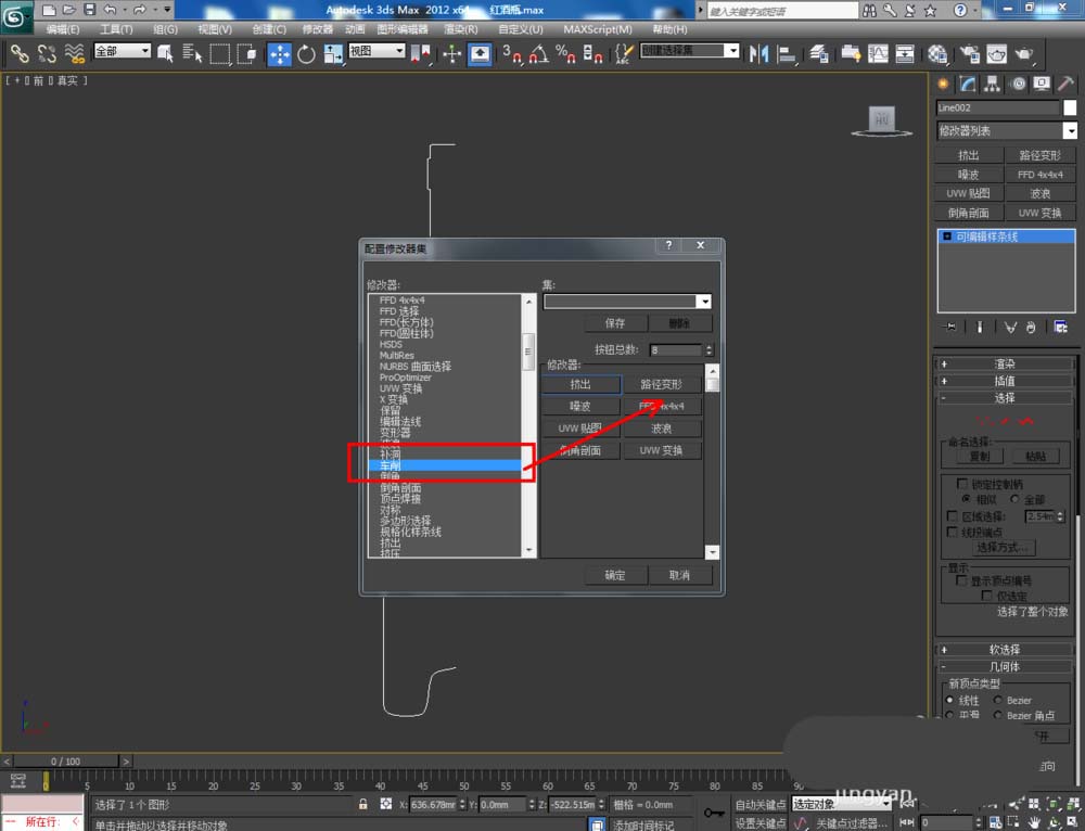 3、點擊【修改】-【配置修改器集】,彈出配置修改器集選項欄,找到【車削】和【渦輪平滑】并將它們拉動到右邊選項欄中,點擊【確定】將車削和渦輪平湖調出;