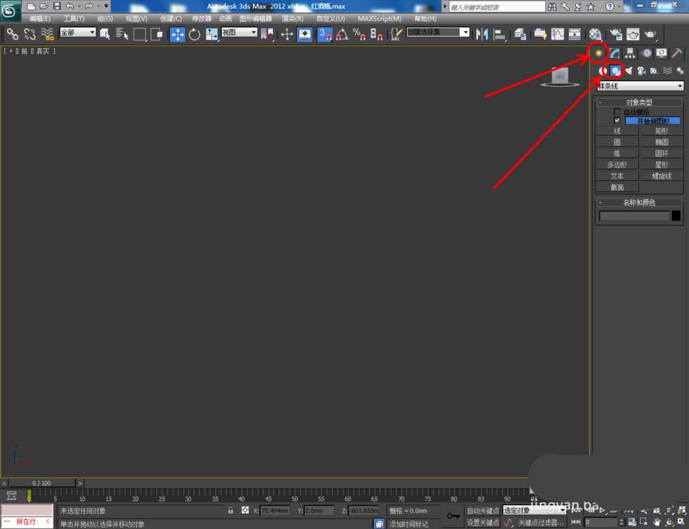 1、打開3Dmax2012軟件,點擊【創建】-【圖形】-【線】,在作圖區域繪制一個線段圖案。選中圖案,點擊【對象顏色】將圖案的對象顏色設置為:白色(如圖所示);