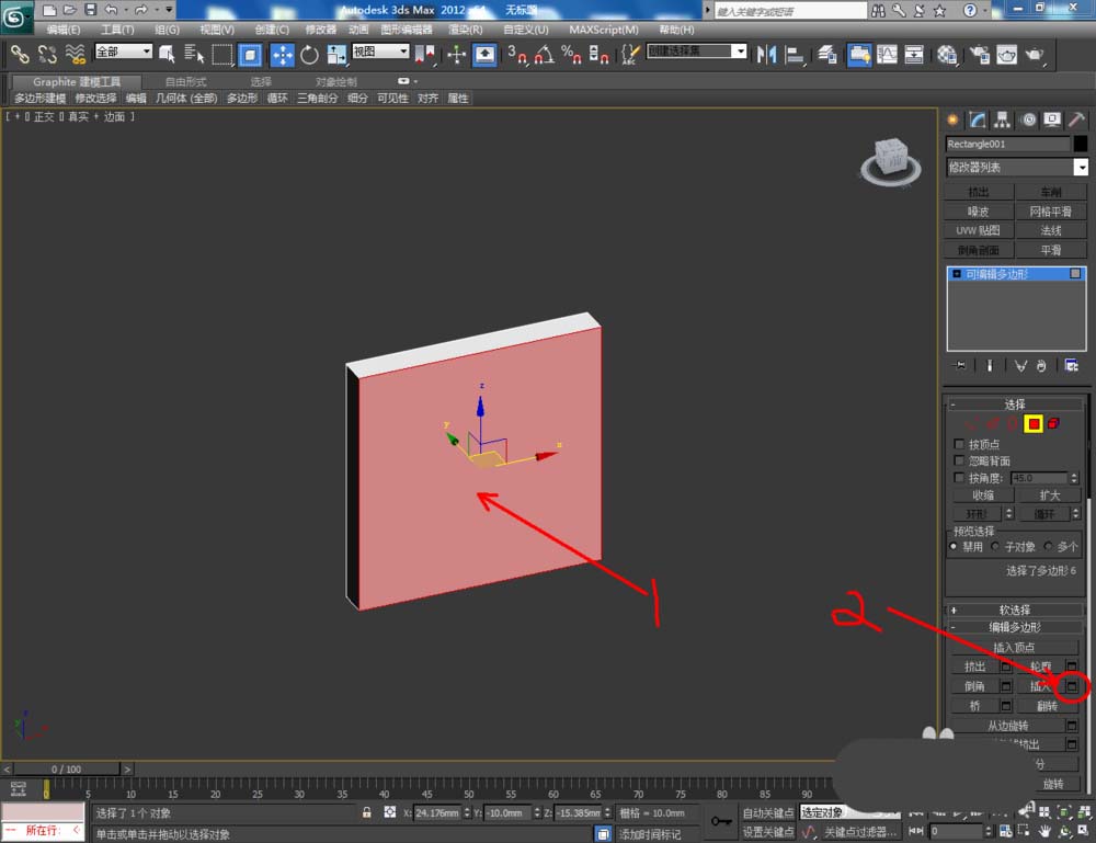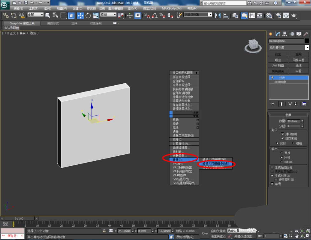 3、選中模型,點擊鼠標右鍵-【轉換為】-【轉換為可編輯多邊形】。點擊右邊工作區中的【面】圖標,選中模型上的面后,點擊【插入】右邊的小方框并設置好插入的各個參數。完成后,點擊【擠出】右邊的小方框,將擠出參數設置為:5mm(如圖所示);
