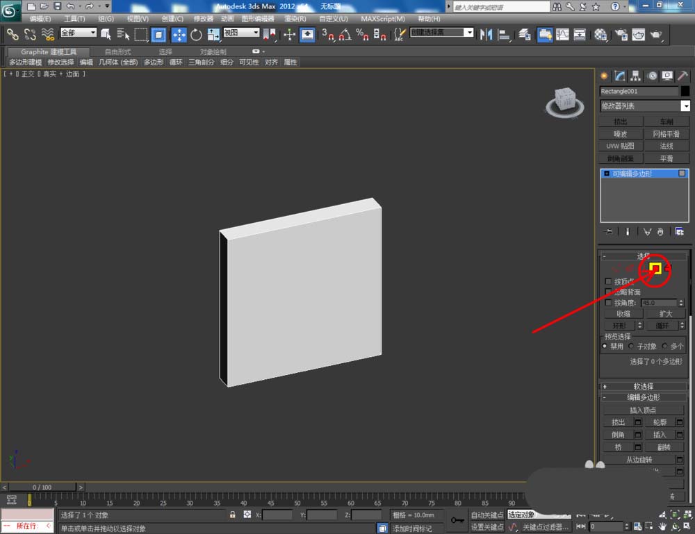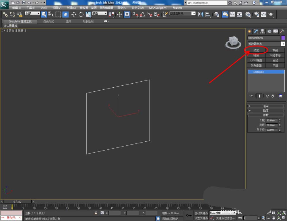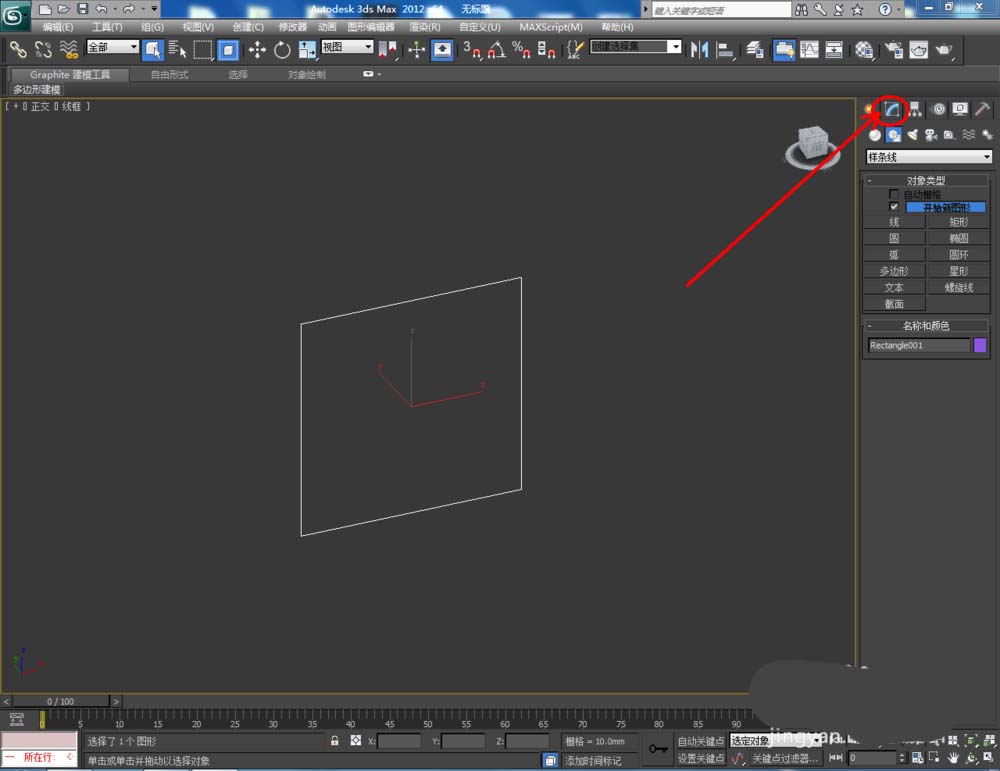 1、打開3Dmax2012軟件,點擊【創建】-【圖形】-【矩形】,在作圖區域繪制一個80*80mm的矩形圖案(如圖所示);