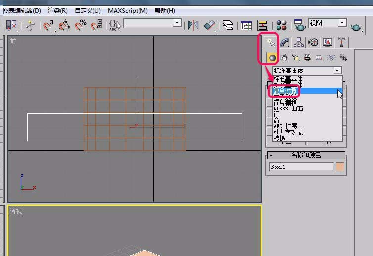 6、打開“創建”選項卡,選擇“幾何體”項下方的下拉菜單中的“復合對象”命令。