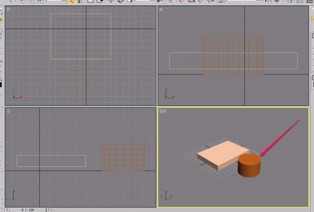 3、將圓柱體用鼠標移動到長方體中間位置,使得圓柱體和長方體融合在一起。