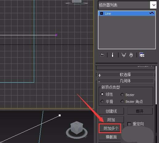 4、選擇線選項在矩形的上下我們繪制出各一條線,然后在修改里選擇樣條線選項,再在其內找到附加多個選項,如圖所示: