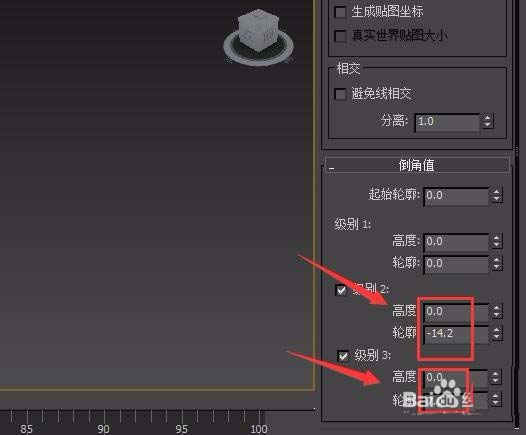 7、選擇繪制的圖形在修改里給它添加一個倒角修改器,然后在修改里依次設置參數如圖所示: