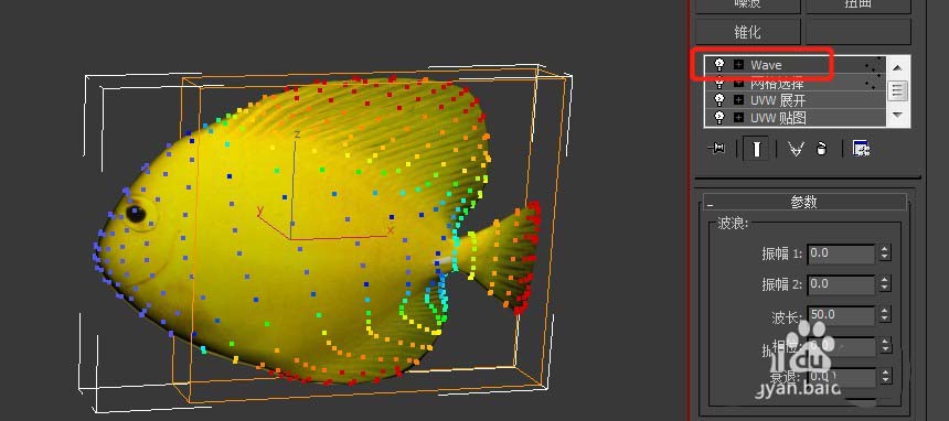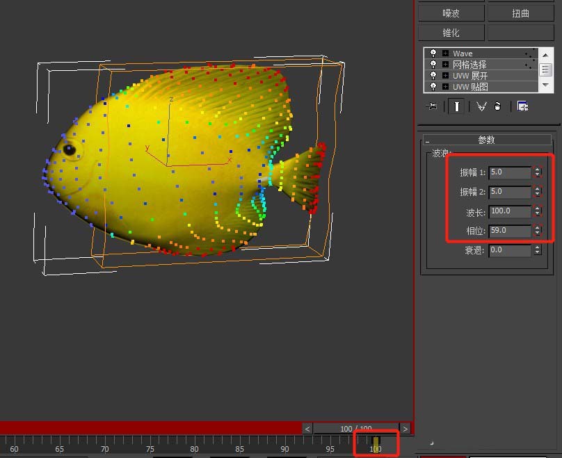 3、然后拖到100幀位置,在“波浪”修改器內,把兩個振幅值、波長、相位按題目要求的數值對應輸入;這樣這個動畫就制作好了,點擊播放按鈕(快捷鍵“?”)就會看到魚鰭和魚尾快速擺動的效果。